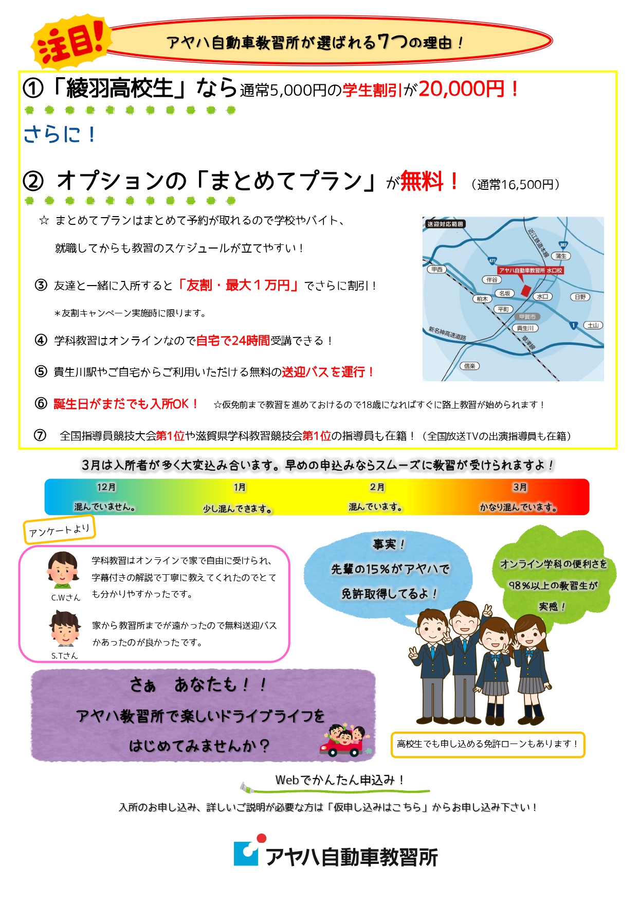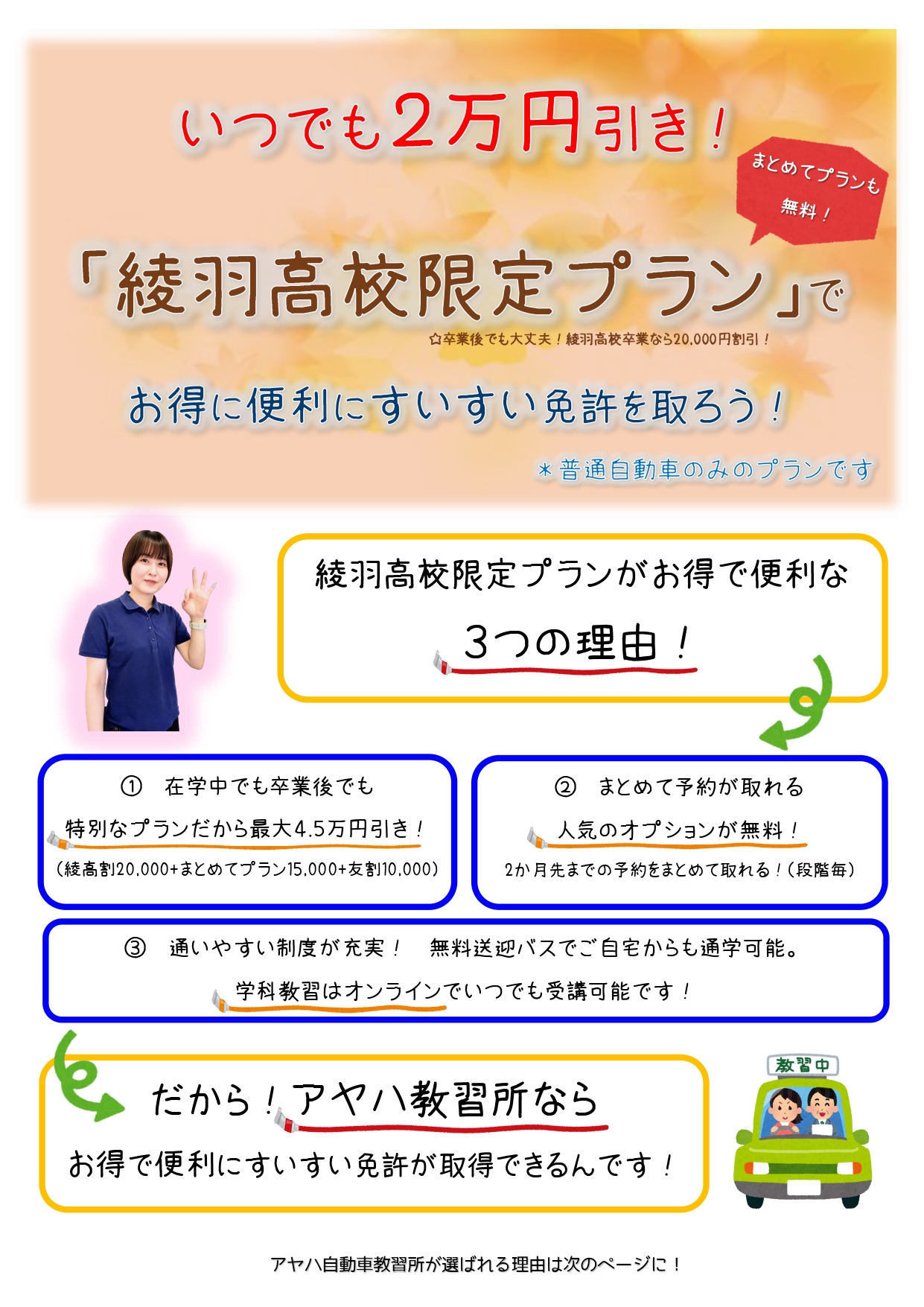 ◇お得に免許が取れる綾羽高校生だけのプランはこちら