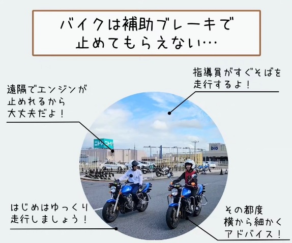 ④バイクは補助ブレーキで止めてもらえないから不安・・・